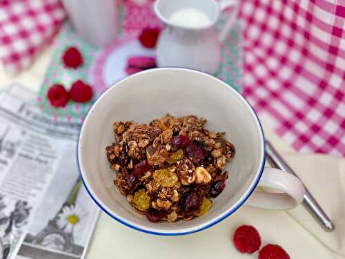 Homemade dark chocolate granola with coconut, brazil nuts, cranberries and sesame seeds with no added sugar, just natural ingredients to sweeten this luxury start to the day, stuck together with the best melted chocolate.