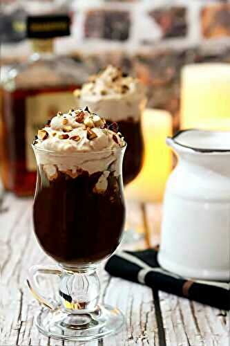 A rich and delicious hot chocolate is mixed with Amaretto liqueur and topped with whipped cream and toasted, chopped almonds.