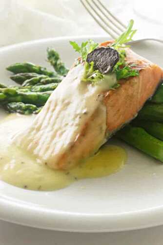 Broiled salmon with white truffle beurre blanc sauce spooned over a thick broiled salmon fillet, a decadent date-night dinner for two.