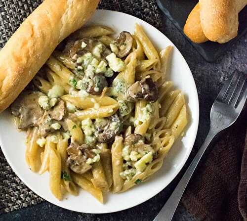 This savory Blue Cheese and Mushroom Pasta features penne noodles bathed in a creamy blue cheese pasta sauce loaded with tender mushrooms.