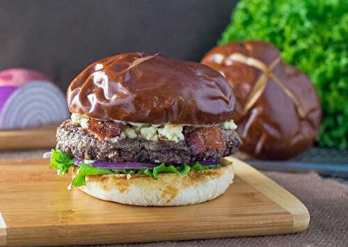 This juicy Bacon Blue Cheese Burger with Balsamic Mayo features the briny flavor of crumbled blue cheese, crisp bacon, and the sharp tang of balsamic vinegar!