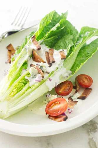 Bacon and blue cheese salad made with hearts of romaine lettuce, creamy homemade blue cheese dressing, bits of crisp bacon and sliced grape tomatoes.