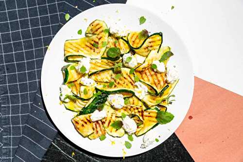 A grilled zucchini salad topped with fresh ricotta, lemon and basil.