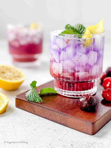 How pretty is this cherry gin smash!?! Muddle together frozen cherries, lemon juice and simple syrup, then layer crushed ice, Empress gin and a splash of tonic water!