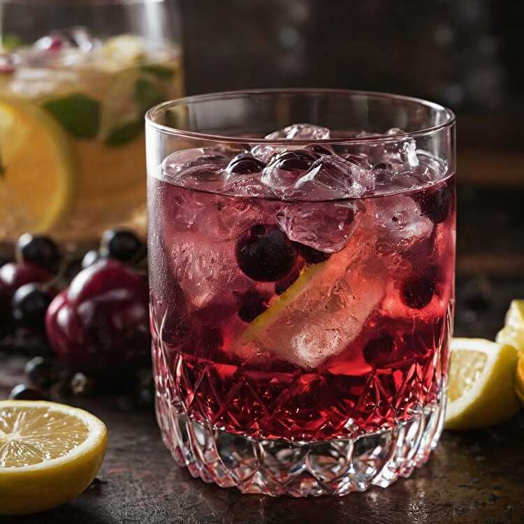 Fruity cocktail with vodka, blackcurrant cream, grapefruit juice and fresh yellow lemon.