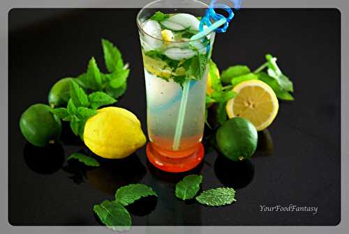 Easy to make Virgin mojito recipe in 6-7 mins with lemon, mint leaves, sugar, ice cubes & sprite/7 up(any white soft drink)/ plain soda water.