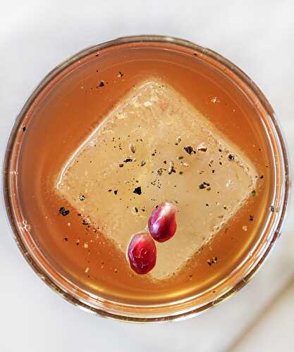 A craft cocktail made with Earl Grey tea and whisky muddled with pomegranate seeds, finished with bitters and fresh ground pepper.