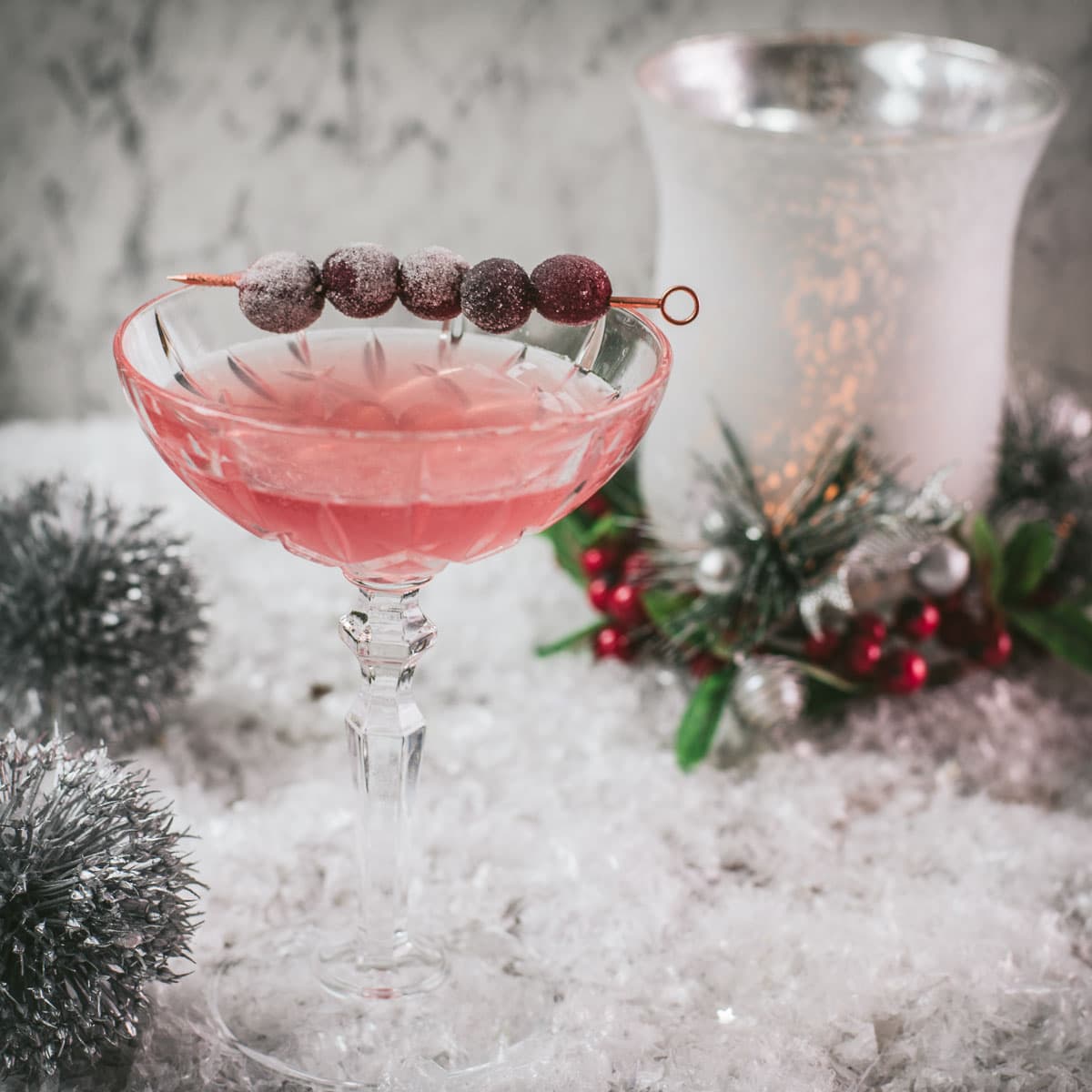 Elevate your holiday celebrations with this Cranberry Maraschino Sour! Featuring floral gin, tart cranberry juice, and a hint of maraschino liqueur, this cocktail is garnished with sparkling sugar-coated cranberries for a touch of holiday magic.