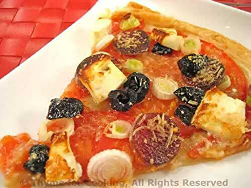 Puff Pastry Pizza with Chorizo, Feta and Olives.