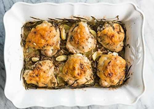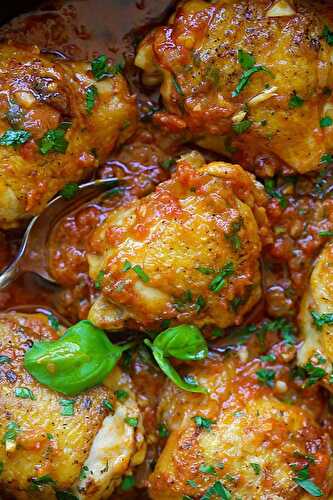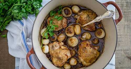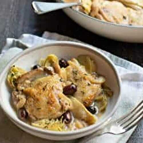 Summer mediterranean braised chicken thighs with artichokes, shallots, white wine, lemon and briny Greek olives.