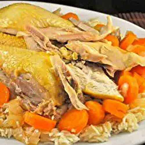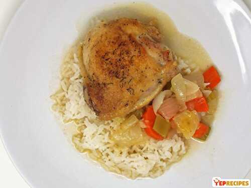 Chicken and vegetables braised in white wine and fresh rosemary, served over steamed jasmine rice.