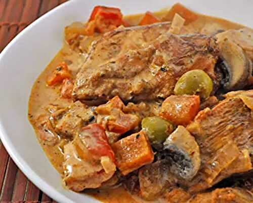 Braised Chicken Thighs, Yogurt Sauce, with red peppers, onions, tomatoes and olives.