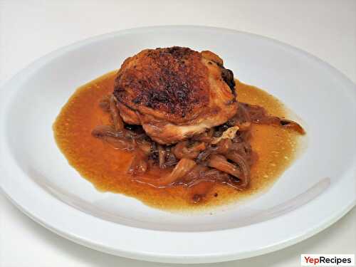 Crispy skin chicken thighs braised in caramelized onions, sherry, and herbs.