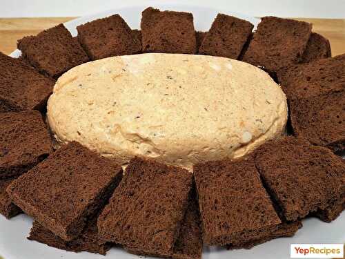A cheese spread made with cottage cheese, cream cheese, capers, caraway seeds, and sweet paprika served with toasted dark rye bread.