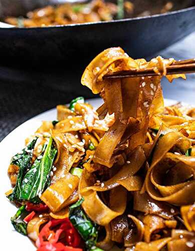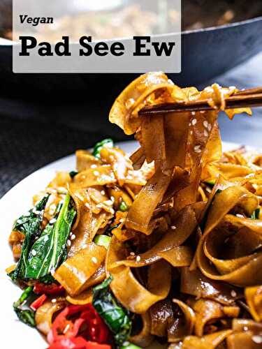 Vegan Pad See Ew is made with flat rice noodles, crispy yuba, Chinese broccoli, and a stir-fry sauce with sweet, savory, and balanced with a dash of vinegar.