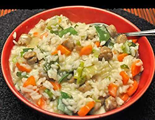 Risotto with Snow Peas, Carrots, Green Garlic and Italian Sausage - a main dish risotto for spring.