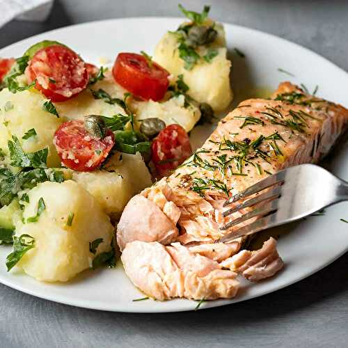 Mediterranean style healthy and easy salmon recipe with air fryer and baking instructions for tender and flaky salmon fillets served with a delicious dill sauce.