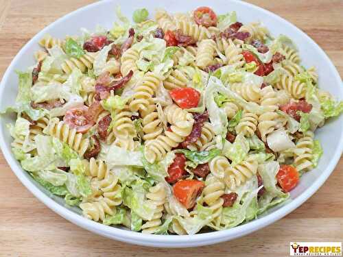 Bacon, lettuce, tomato, and rotini pasta tossed with a creamy herb dressing.