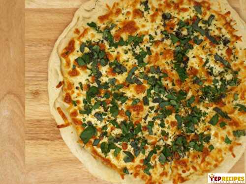 A homemade pizza dough brushed with garlic oil then topped with mozzarella cheese and fresh herbs.