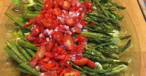 Oven Roasted Asparagus and Tomatoes, juicy ripe tomatoes roasted with crunchy and tender asparagus and garlic, makes the perfect side dish!