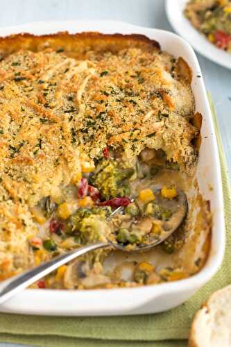 A creamy vegetable bake packed with colourful veggies, smothered in a creamy sauce and topped with crispy, cheesy breadcrumbs.