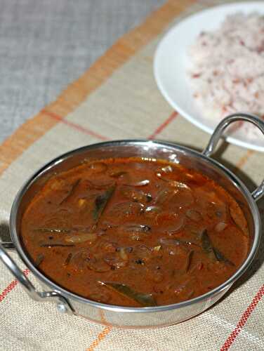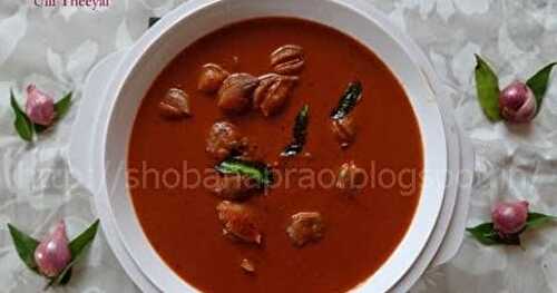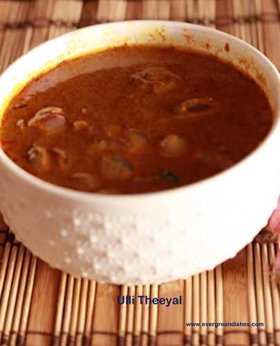 Ulli Theeyal is a spicy curry of shallots cooked in paste of roasted coconut and other spices along with tamarind extract.