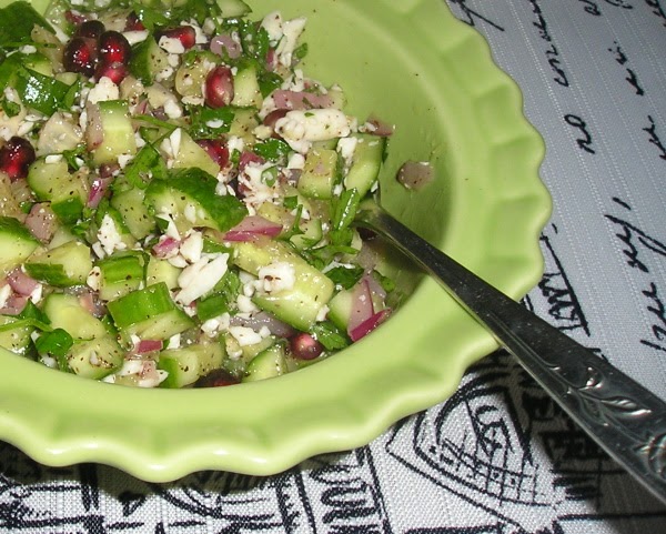 Indian style salad with pomegranate and cucumber along with a blend of spices.