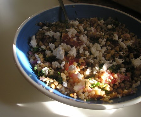 This nice pearl couscous salad recipe features pearl couscous as well as ingredients like sun-dried tomatoes, green olives and onion as well.