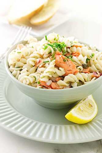 This Salmon Salad with Spelt Pasta is filled with salmon, capers, dill, onions, chives, spelt pasta and tossed with a tangy lemon vinaigrette.