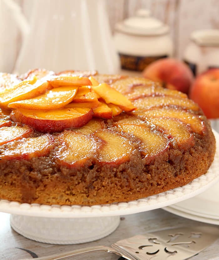 This fluffy gluten-free ground almond and peach cake is an ideal cake for visitors to have ready to enjoy with a cup of coffee or tea.