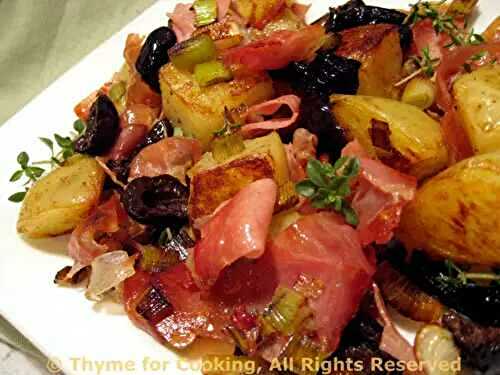 Potatoes with Prosciutto, Olives, Green Garlic and Thyme