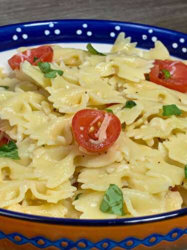 This Bow-Tie Pasta with Fresh Basil & Tomatoes recipe is so easy to make it's not even funny.