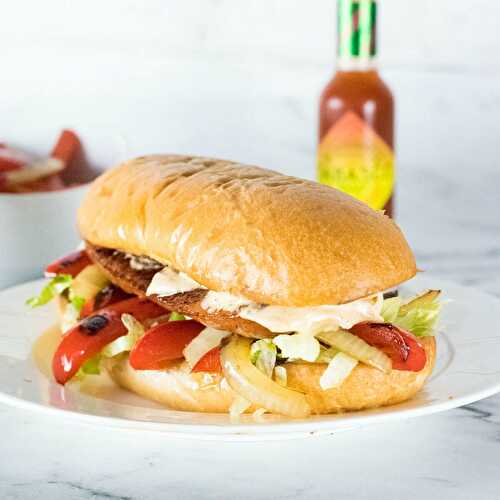 This andouille sausage sandwich is loaded with sautéed peppers, onions, and a seared split andouille sausage served on a hoagie roll.