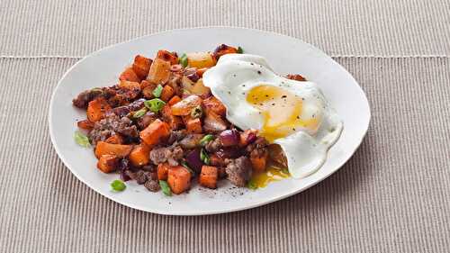 An easy, colorful quiche with red peppers, leeks, sausage, and a shredded potato crust.