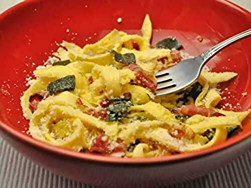 Egg "Noodles" with Bacon and Sage; the noodles are made from eggs with just a tiny bit of flour to stabilize - great low-carb fare
