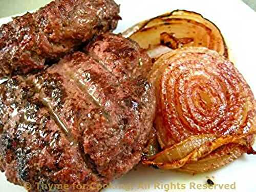 Grilled onion burgers are juicy beef burgers topped with grilled onions, blue cheese, peppery arugula, and a tangy yogurt sauce for the perfect blend of flavors.