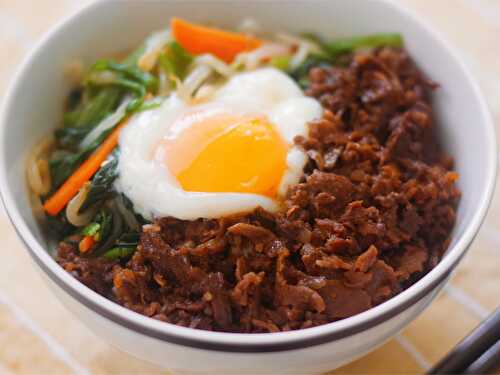 Here is Japanese beef bowl recipe - just like Korean bibimbap with teriyaki & spicy sauce! Quick, easy and delicious bowl!