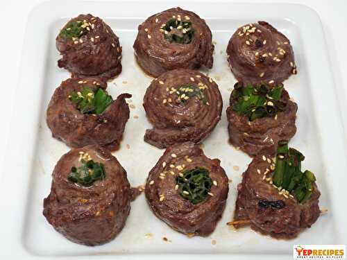 A Japanese dish consisting of thinly pounded beef marinated then rolled with scallions and broiled.