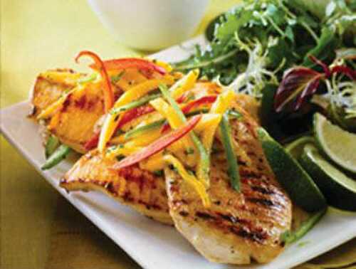 I promise you'll fall in love with this mango chicken recipe! Chicken marinated in mango vinegar, griddled and served with a fruity mango salsa.