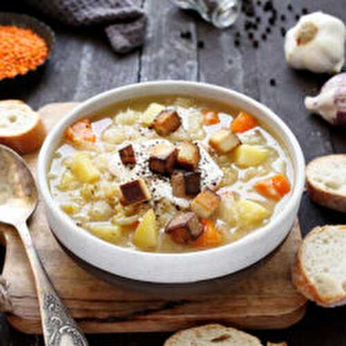 Vegan Sauerkraut Soup with smoked tofu is a wonderful delicious winter soup.