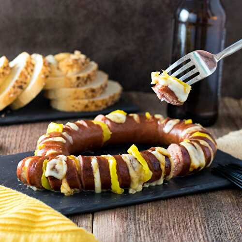 This Cheesy Hasselback Sausage is glazed in a mouthwatering mixture of Dijon mustard, brown sugar, and Worcestershire, while every crevice is packed with tangy pepperoncini and melted cheese!