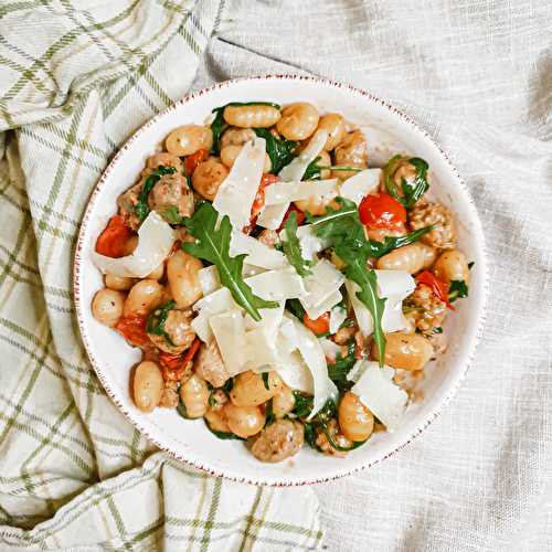Italian sausage meatballs with fried gnocchi recipe , tossed through cherry tomatoes and rocket, and sprinkled with parmesan cheese.