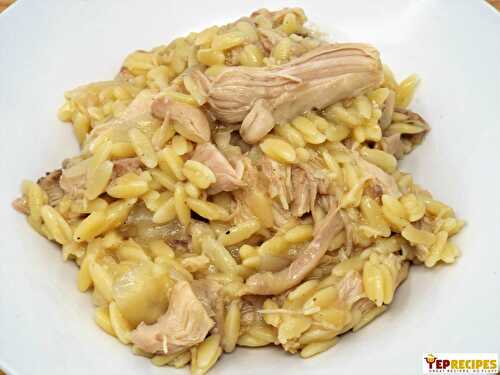 Lemony chicken thighs and orzo pasta prepared in your slow cooker.
