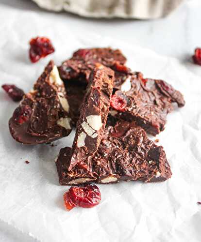 Dried cranberries & almonds are surrounded by homemade dark chocolate in this healthy chocolate bark recipe.
