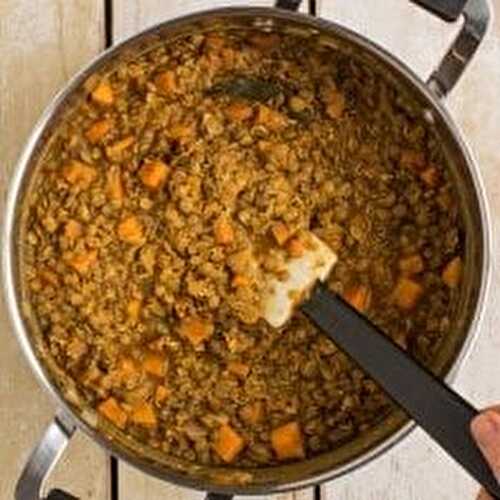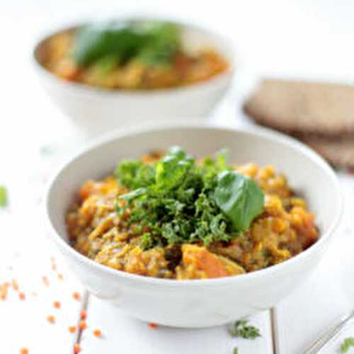 Simple vegan spicy red lentil and sweet potato stew with kale, hokkaido and carrots.