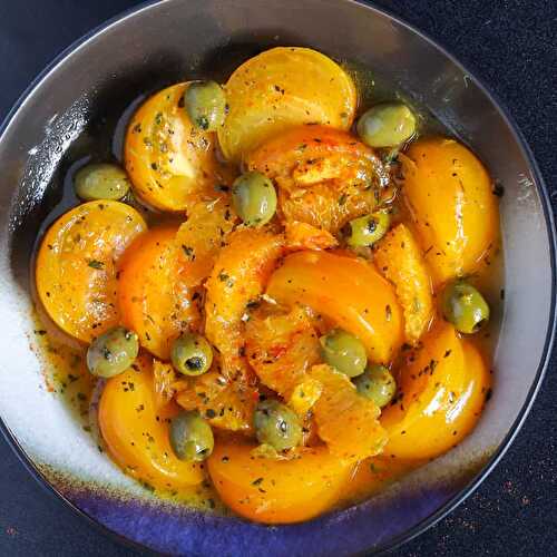 This tomato salad recipe with marinated olives features yellow heirloom tomatoes.