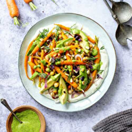 Roasted Carrot Salad with tahini yogurt and carrot green drizzle is packed with exciting textures and flavors.