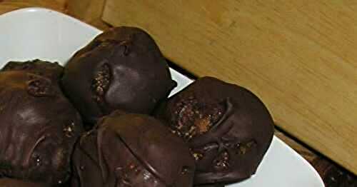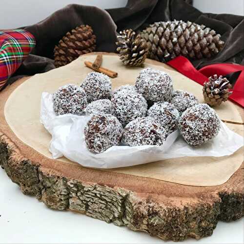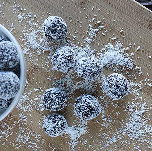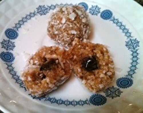 No bake, bite-sized coconut, raisin and chocolate snowballs.