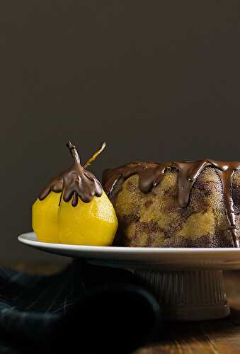 A chocolate & vanilla vegan semolina cake with pears cooked in syrup! This is a Greek traditional super moist cake also known as halva!