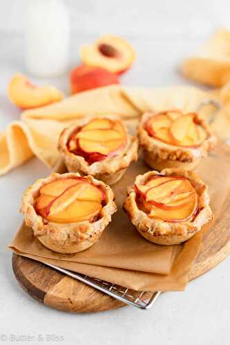These Peaches and Cream Mini Pies are a delicious summer dessert! Bright and sweet peaches sit on a pillow of vanilla cream, and tender and buttery pie crust brings these mini pies together.